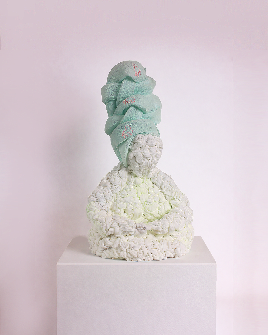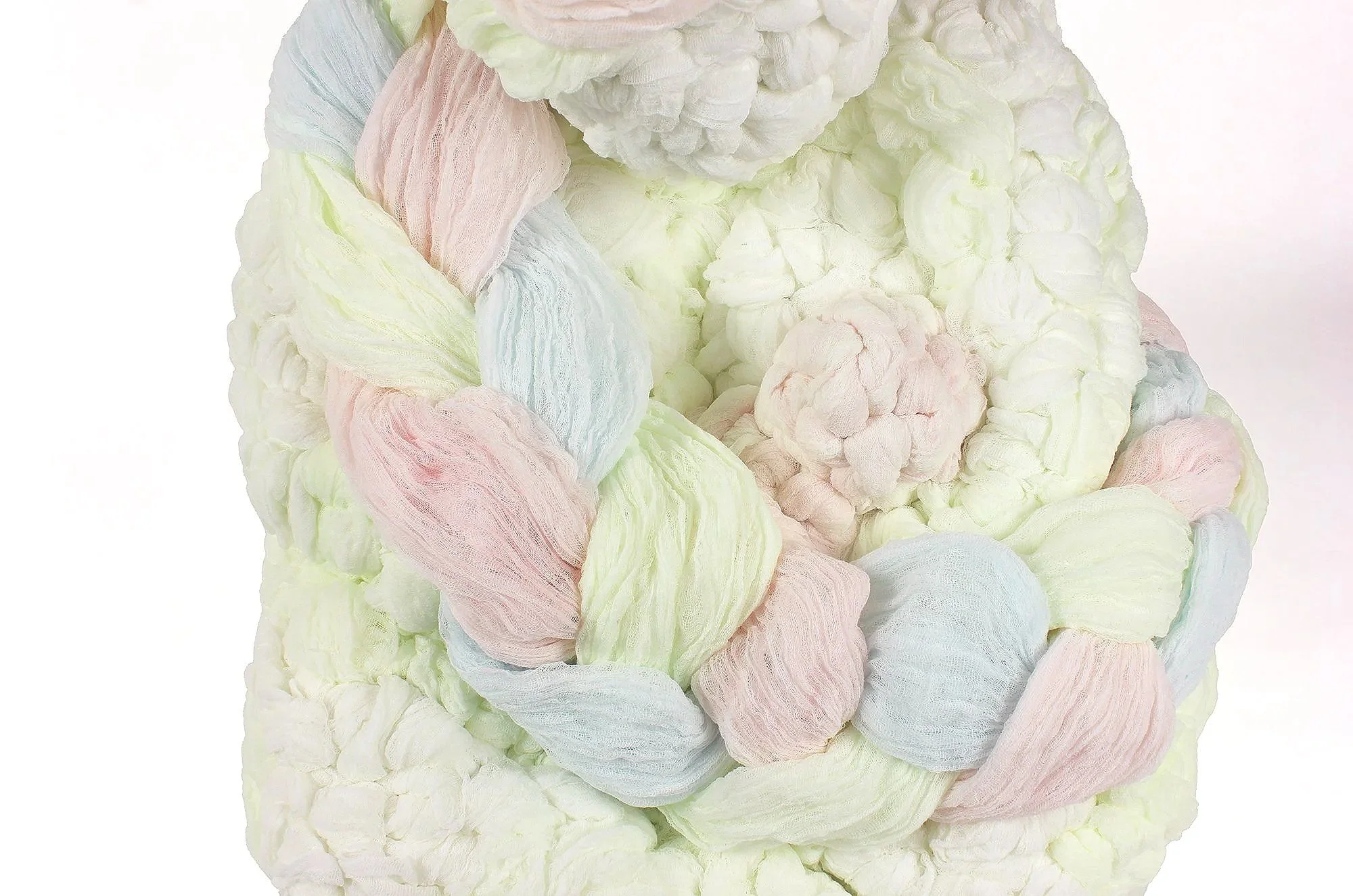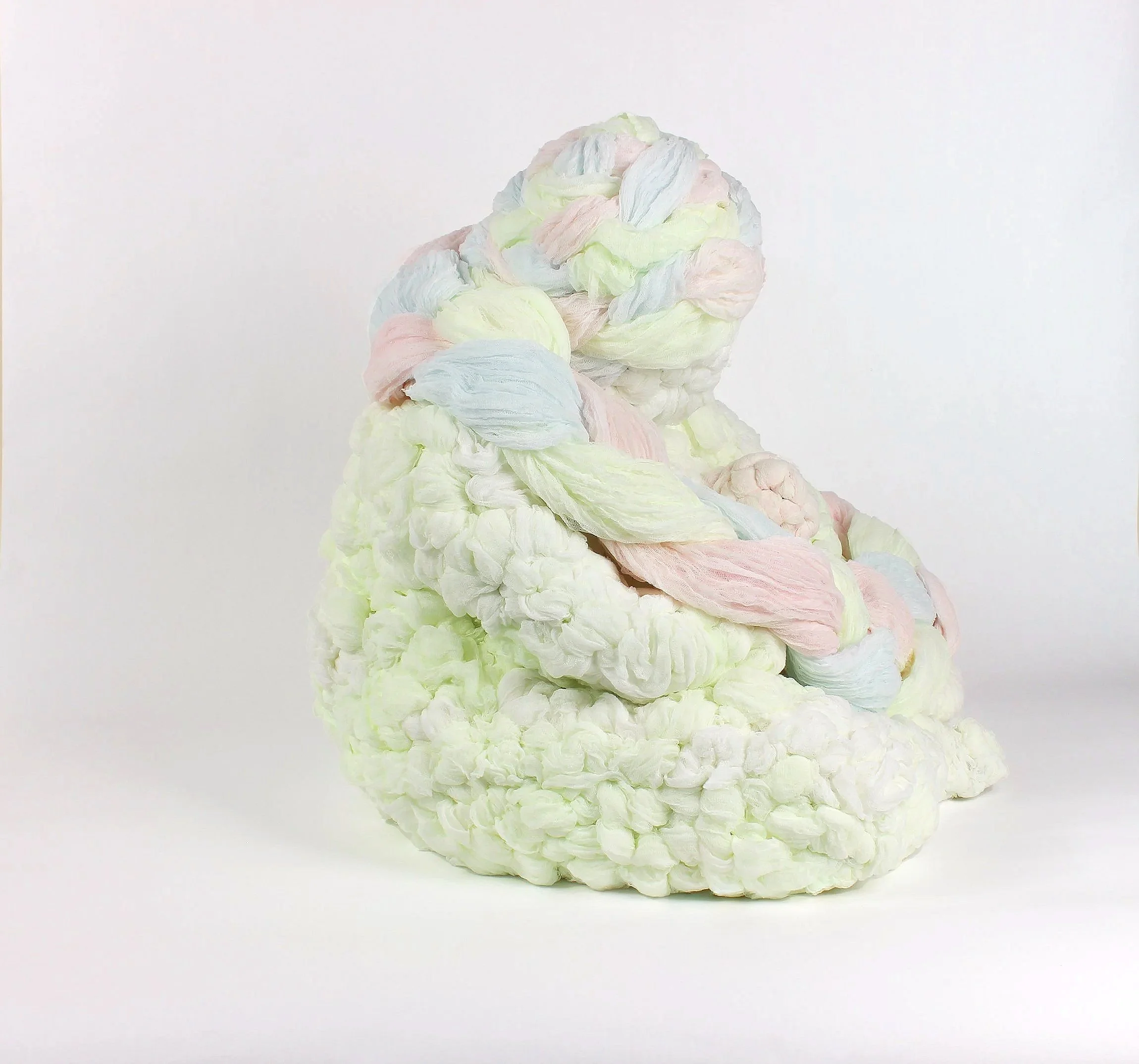 These works treat softness not as fragility, but as a structural force. Built through wrapping, binding, and accumulation, each form holds tension between collapse and support - where care becomes an organizing system. Drawing from domestic textile traditions and conceptual systems thinking, the sculptures use repetition and constraint to shape form. Braids, loops, and layered surfaces function as both gesture and architecture - binding bodies, containing energy, and sustaining weight.
