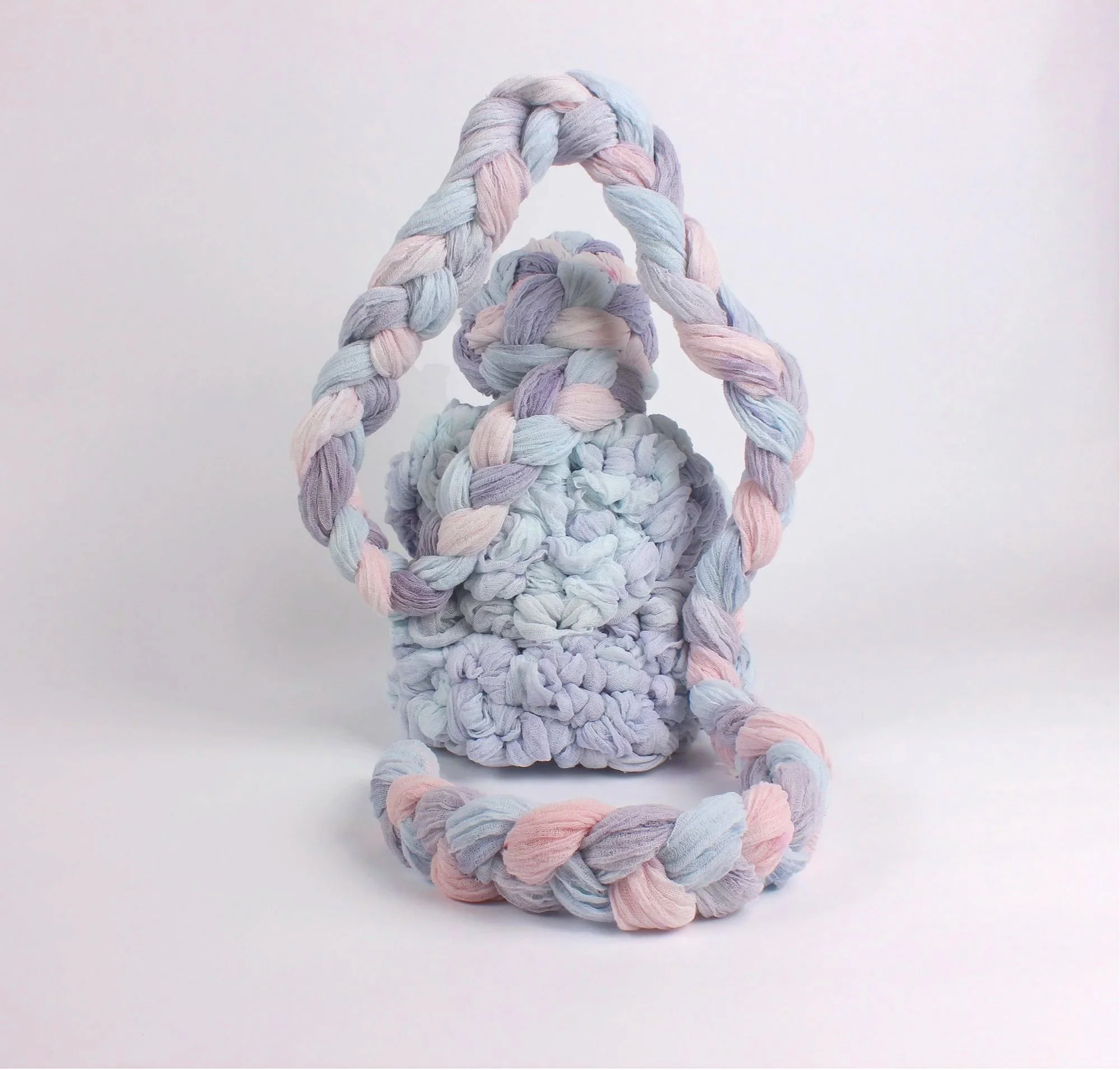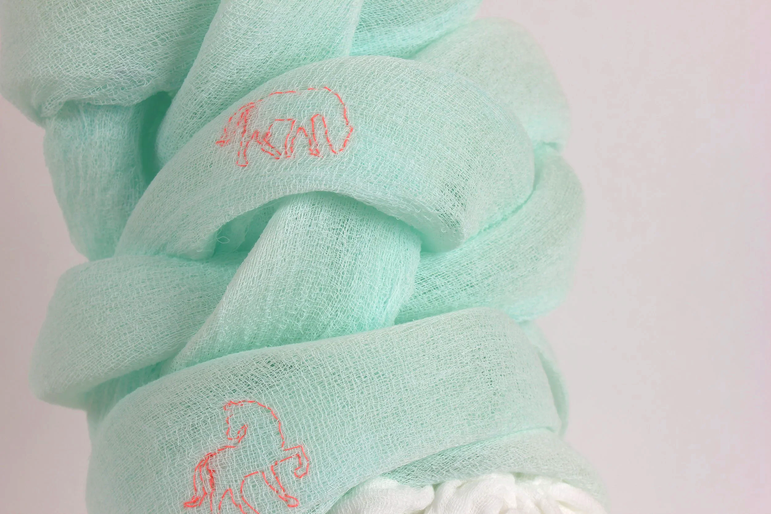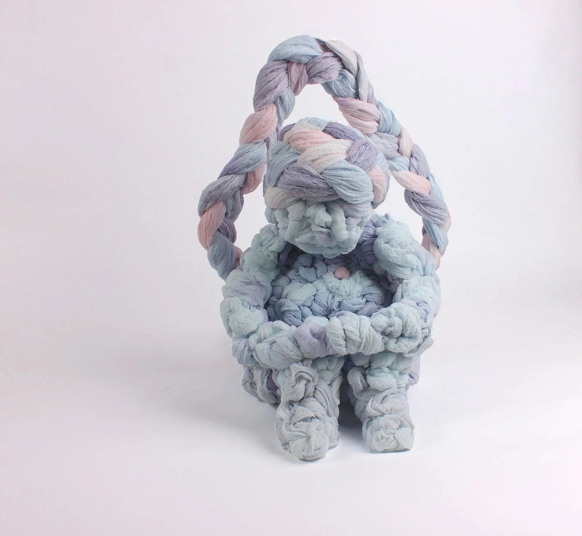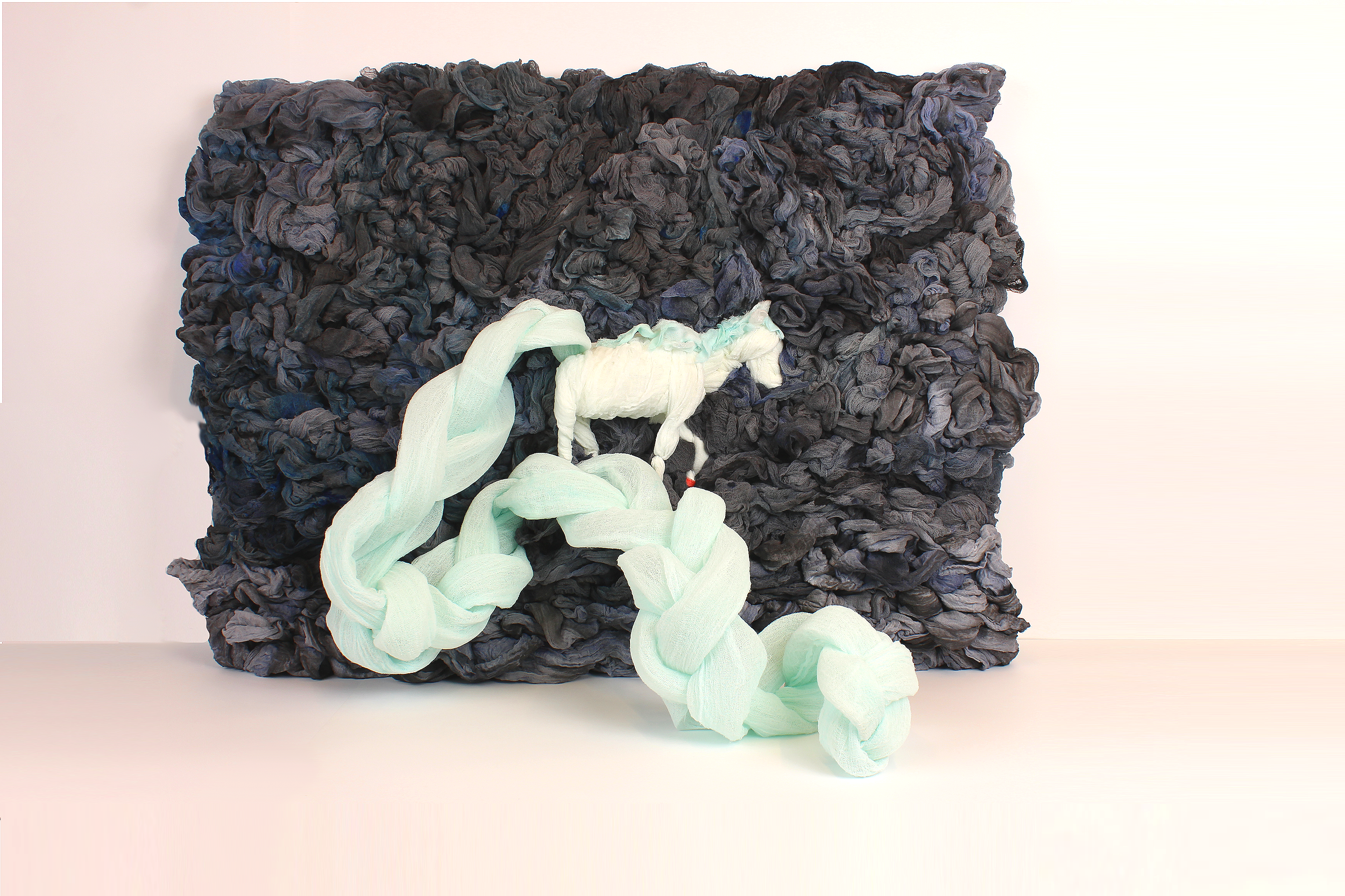 These works treat softness not as fragility, but as a structural force. Built through wrapping, binding, and accumulation, each form holds tension between collapse and support - where care becomes an organizing system. Drawing from domestic textile traditions and conceptual systems thinking, the sculptures use repetition and constraint to shape form. Braids, loops, and layered surfaces function as both gesture and architecture - binding bodies, containing energy, and sustaining weight.